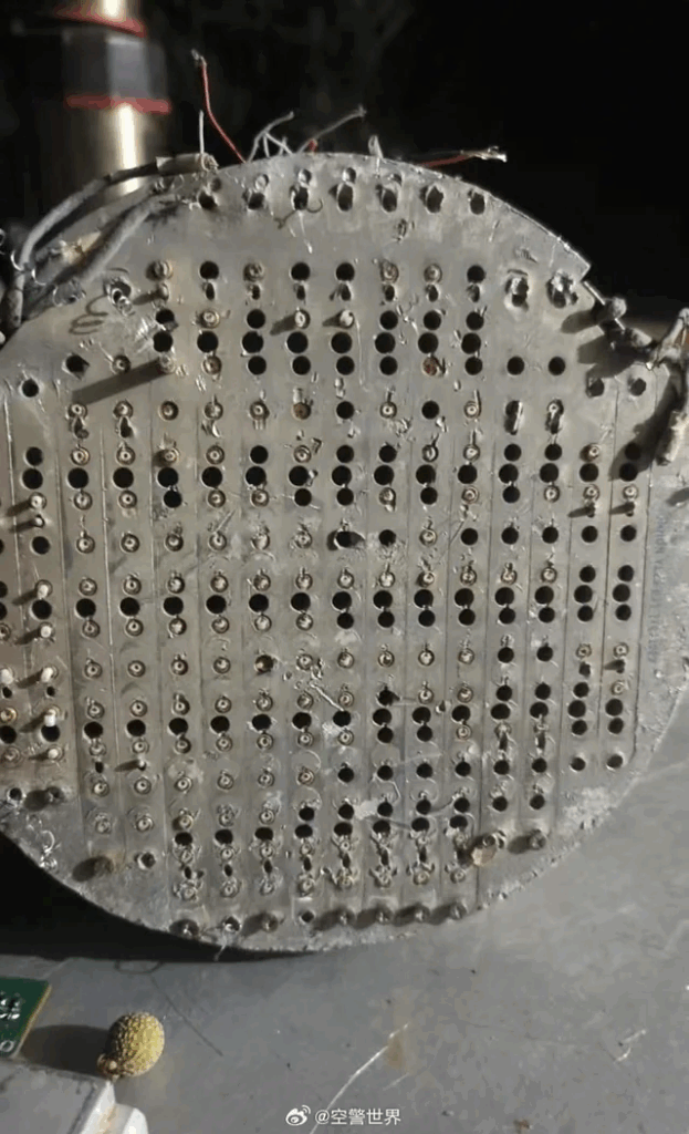 Si o alta poza, cu aceeasi componenta dar care, la o prima vedere, aparține unei alte rachete (de remarcat montura de pe margine, în care se potrivesc perfect modulele AESA):